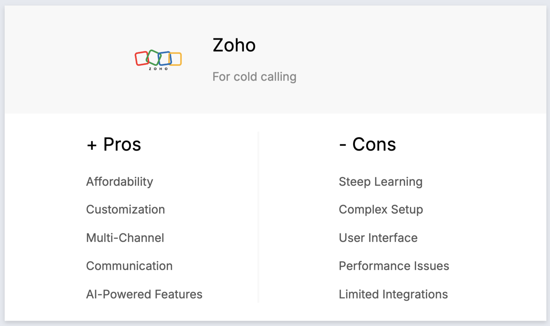 - AI-powered sales assistant (Zia): Provides predictive analytics, task automation, and intelligent suggestions to enhance cold calling performance.