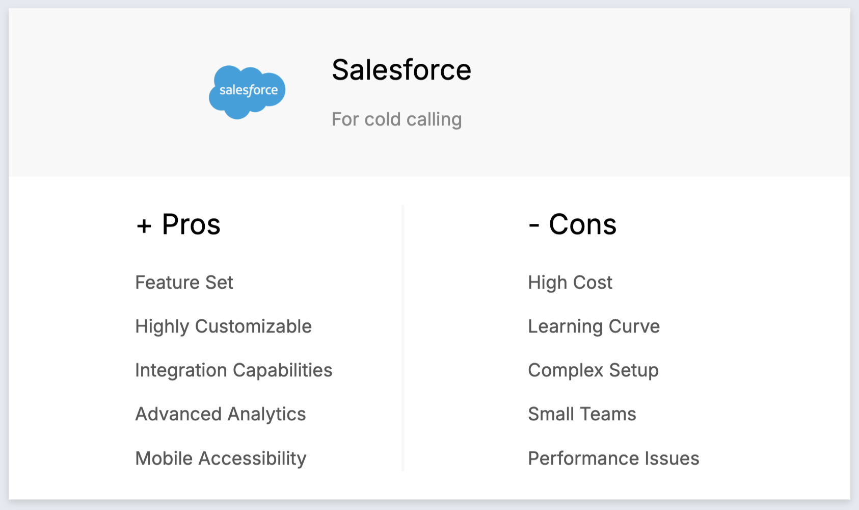 - Comprehensive feature set: Salesforce offers a wide range of features that support every aspect of cold calling, from lead management to follow-up automation.