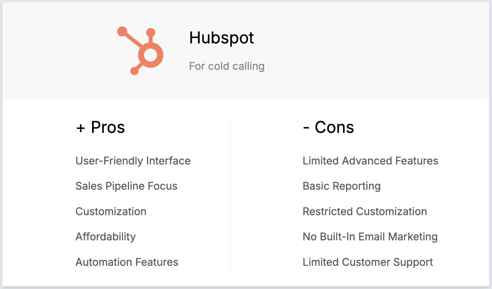 - Sales Hub: Provides deal tracking, pipeline management, sales automation, and reporting, essential for managing and monitoring cold calling efforts and converting leads into customers.