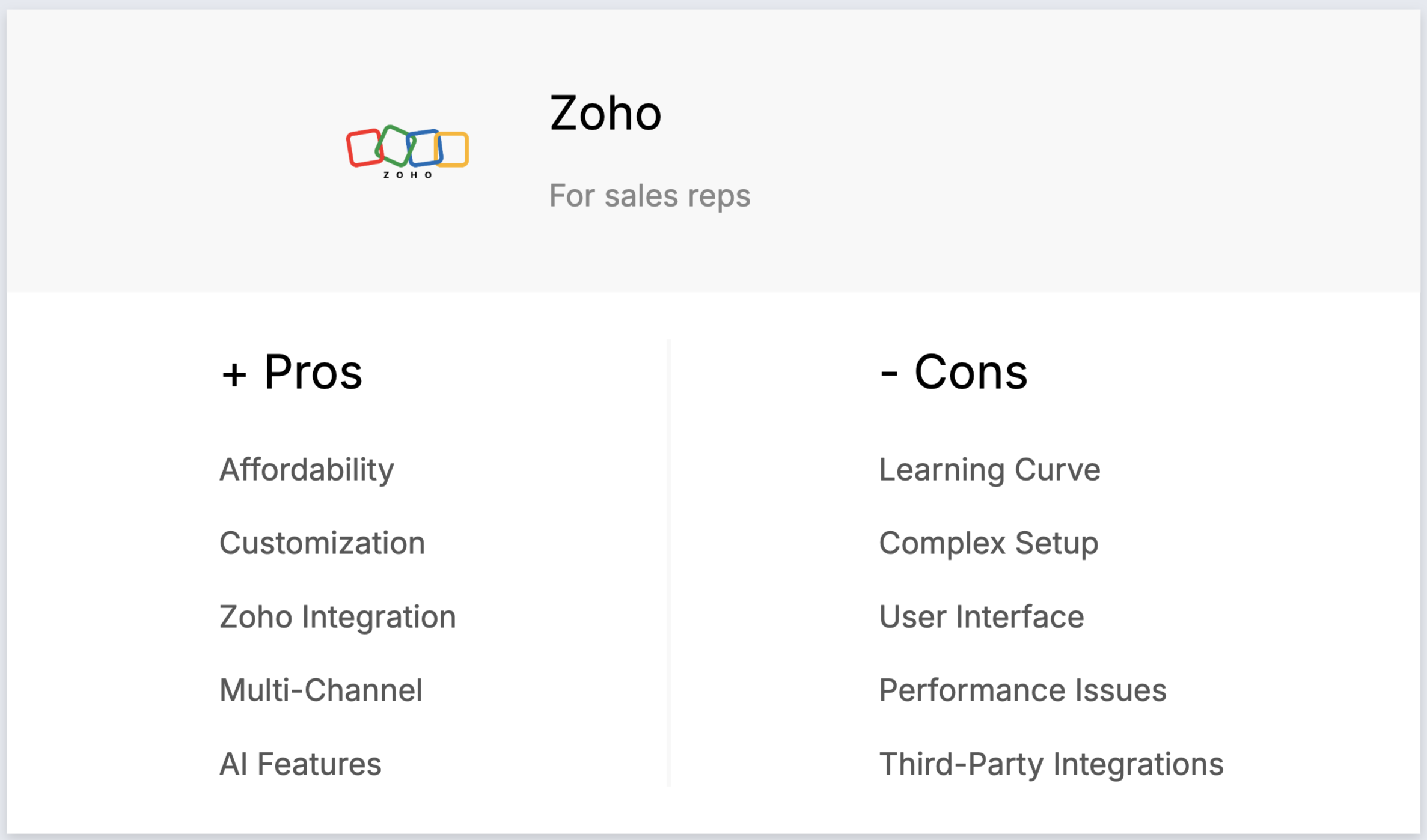 - AI Assistant (Zia): Provides analytics and task suggestions for medium teams, though capabilities are limited compared to specialized sales AI tools.
